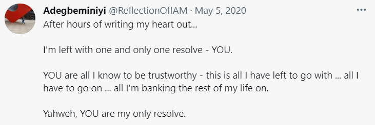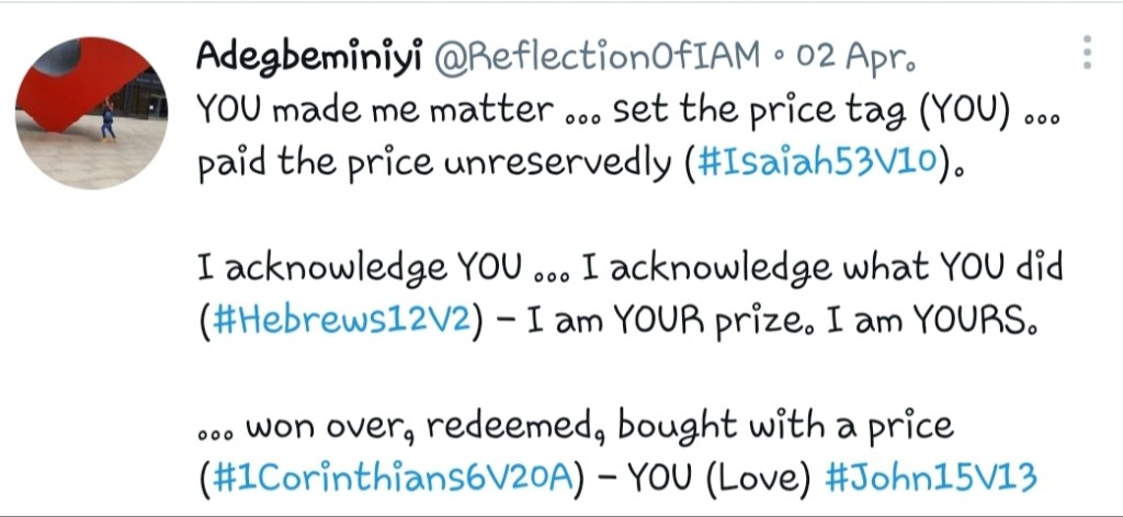 Every time I believe what He tells me … every time I repeat what He tells me (especially when I’m yet to see the physical/full manifestation of it) … every time I spend time in His Word … every time I fix my thoughts on His Word (fix my gaze, my worshipping eyes, on Him) … every time I make a move in any direction solely based on His Word – all these give Him the MOST pleasure.