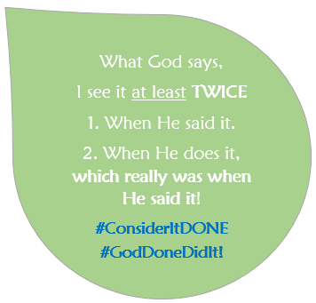 In other words, God is saying: when I make you a promise, in the very moment that the Words come out of My mouth, consider it DONE!💖