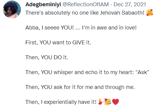 I took away a number of things from this interaction. One being that the HolySpirit is super cool! π₯° … Another, which is more to the next point I’m trying to make, is that it behooves me to let God BE, to let God GIVE. Letting God give glorifies Him – one way to do this is by asking God.