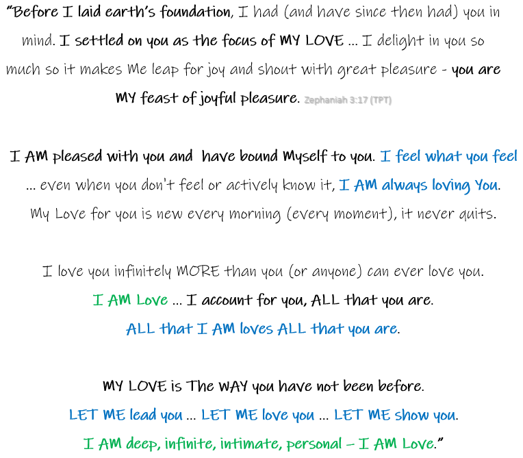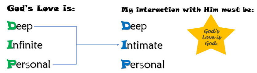 What I’m about to highlight (as powerful and substantive as it is) is only but a glimpse into aspects of God’s Love. I share it as an expression of praise, and in celebration of the finished work of Christ – the basis, essence, and entirety of which is God’s Love … a love that is deep,infinite, andpersonal.