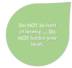 Hebrews 3:7-8,13 encourages us to not harden our hearts when we hear the Voice of Love – the Word of God, the very means by which hearing happens – Romans 10:17