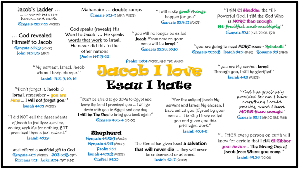 The aspect of what the HolySpirit continues to teach me that I’m excited to share with you stems from and is related to these words: “Jacob I loved, Esau I hated“. See Romans 9:13 >>> Malachi 1:2B, 3A