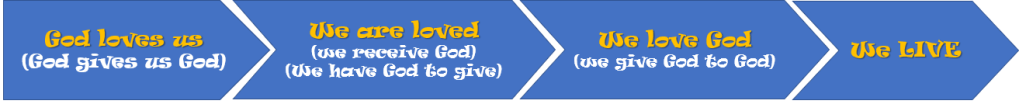 Based on the understanding outlined so far, we see that there is a sequential connection between (1) being loved – receiving God, (2) loving God – giving God to God, and (3) living, all of which is possible solely because God loves us.