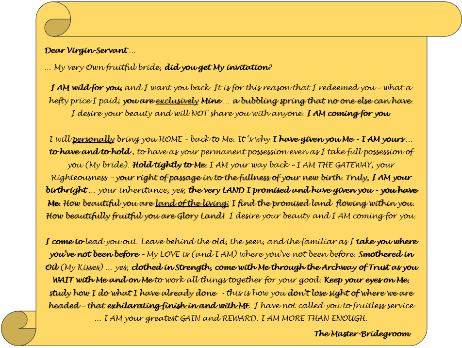Like Gideon, you are who God says you are. God’s invitation to you is the indication that you are a virgin-servant. It does NOT matter if you don’t yet look like it to you, it matters more (and only) that God’s invitation is extended to you.