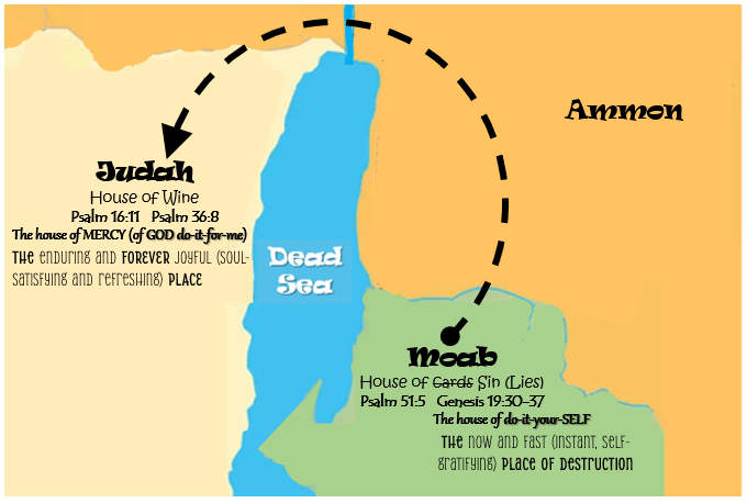 Okay, back to Moab’s origin story. Both daughters took turns having their way with Lot while he was drunk and none the wiser. Their willful act of sin led to the birth of two sons – one by each daughter. The first-born son was Moab! Like the first-born son(s) of Egypt, Moab represents the pride of the flesh that exalts its SELF against God in the same manner that lie sets it SELF against Truth. Moab was born in sin and represents a house of sin. Moab is an expression of all things born of the seed of deception (sin) – all things born of the seed of the father of lies.