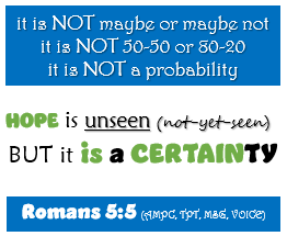 Contrary to popular belief unbelief, HOPE is not a maybe. In Truth, howbeit unseen for a time, HOPE is a certainty, the evidence (substance) of which comes with God’s Voice … it comes when God calls you by His revealed Name.