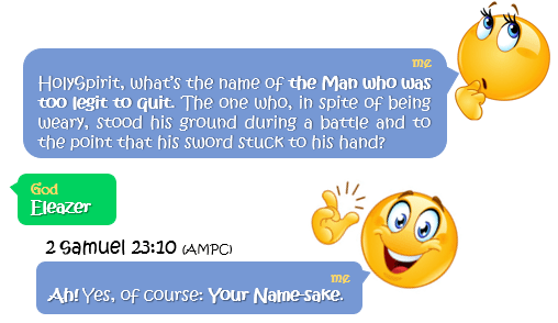 Like the Sword in ELEAZER’s Hand, the Promise God made us to be and the one He gave us to have (a two-edged Promise) is the Sword of the Spirit: the Mighty razor-sharp Spirit-Sword of the spoken Word of God –Ephesians 6:17(TPT, AMPC) – USE IT!Pair up with the HolySpirit Who is the Wielder of this Sword and The GREAT PROMISE KEEPER.Be a Promise Keeper too.